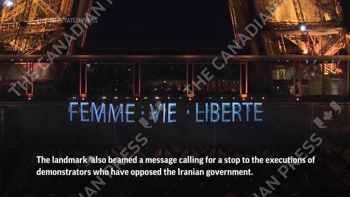 Paris's iconic Eiffel Tower lit up the night on Monday with the slogan "Woman, Life, Freedom," in support of the protest movement spilling beyond Iran. (Jan. 17)