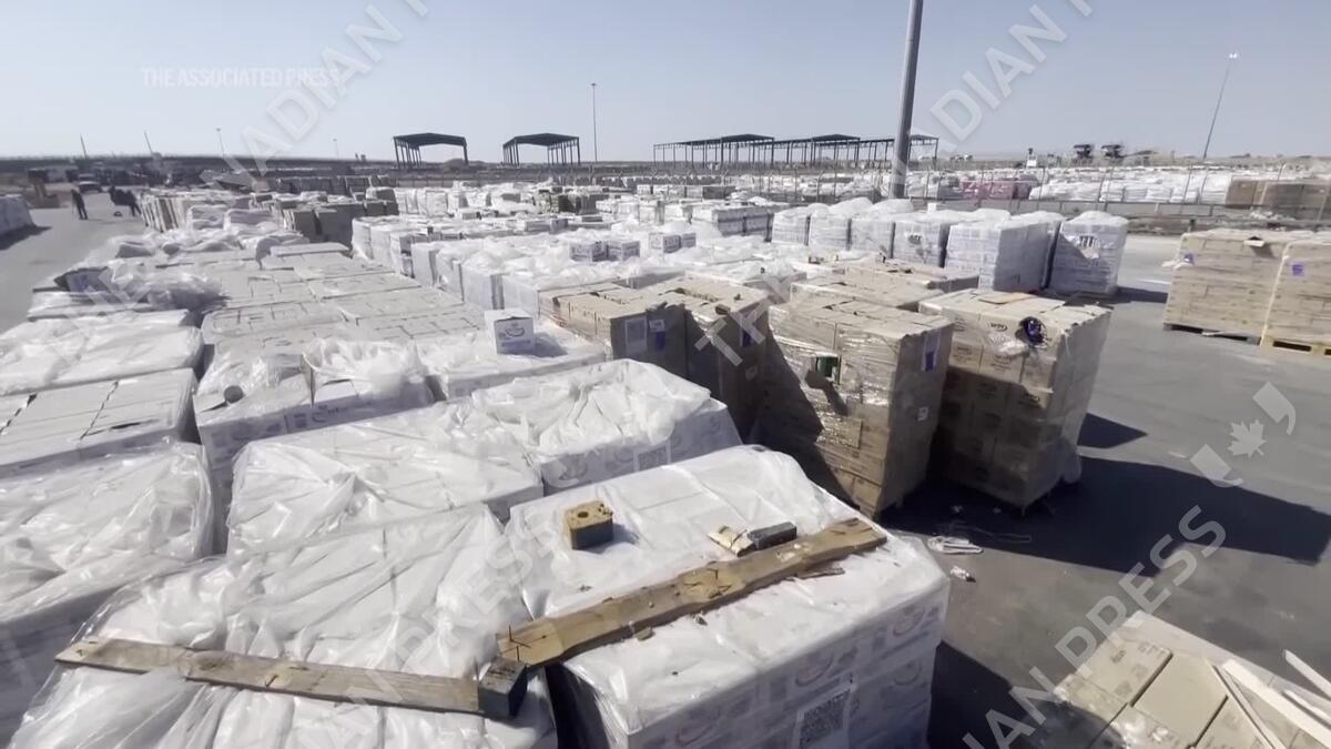 Israel’s military took journalists on Thursday to the Gaza side of the Kerem Shalom crossing to show what they claim is humanitarian aid awaiting collection. (AP video by Ohad Zwigenberg)