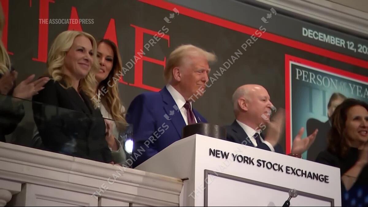 President-elect Donald Trump rang the opening bell at the New York Stock Exchange Thursday after being recognized for the second time by Time magazine as its person of the year.