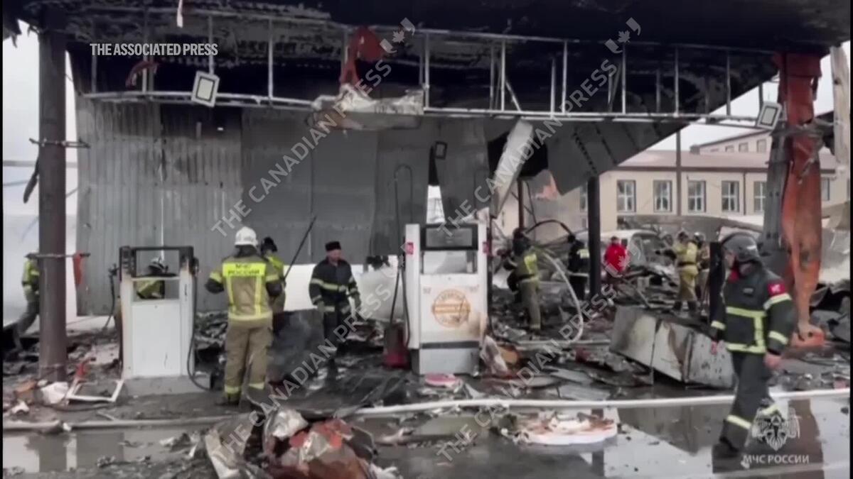 Firefighters clear up the aftermath of an explosion at gas station in Grozny