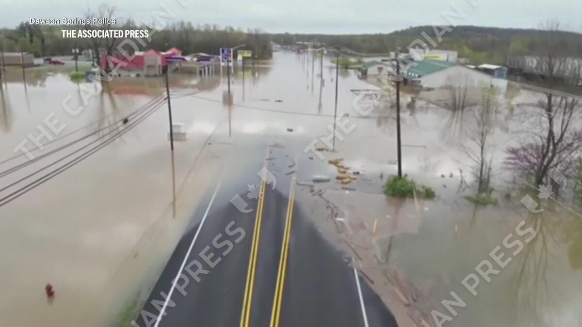 The storm system resulted in at least 16 deaths by early Sunday, with overnight tornado and flash flood warnings setting up more severe weather that forecasters say could cause rising waterways for days to come. Drone footage showed the severe extent of the flooding in the Kentucky towns of New Haven and Dawson Springs.