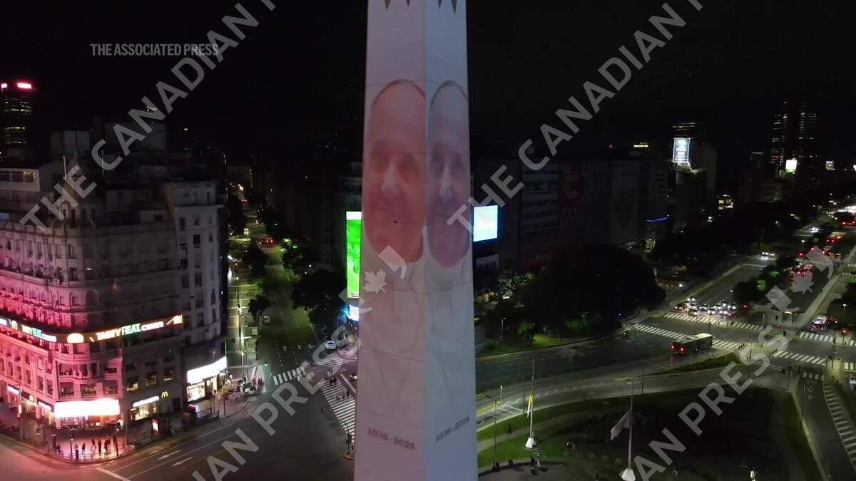 Image of Pope Francis and black ribbon projected onto Buenos Aires obelisk