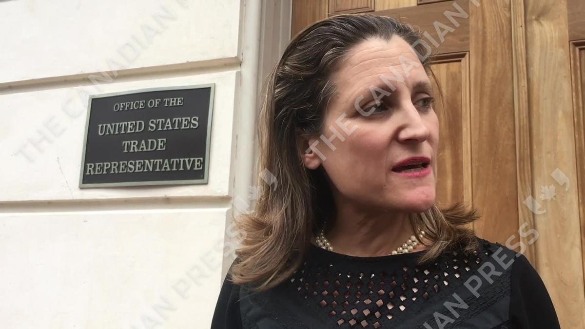 Foreign Affairs Minister Chrystia Freeland speaks about the state of NAFTA renegotiations after meeting with U.S. Trade Representative Robert Lighthizer in Washington on Wednesday, Apr. 25, 2018. SOUNDBITE: Chrystia Freeland, Canadian Foreign Affairs Minister PLACELINE: Washington, U.S.A. CREDIT: The Canadian Press. LANGUAGE: English CONTAINS: Four clips separated by black 1-second bumpers. Audio is best quality available.