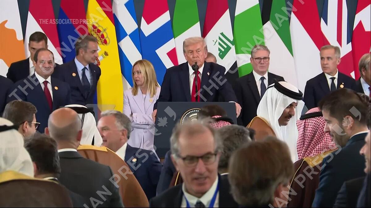 President Donald Trump and Canadian Prime Minister Mark Carney share a laugh in Egypt. Carney joked, "I'm glad you upgraded me to president," during comments Trump made at a summit on Gaza's future. In reply Trump said "at least I didn't say governor."