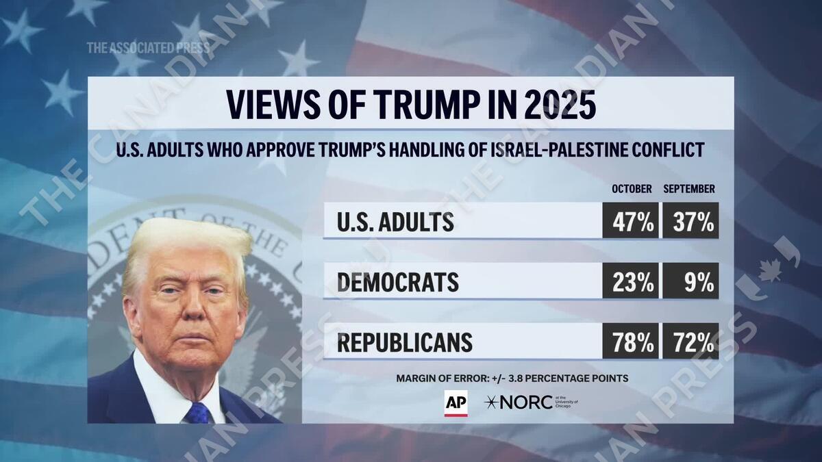 More U.S. adults support President Donald Trump's handling of the conflict in Israel after he brokered a ceasefire deal in Gaza, a new AP-NORC poll finds — but his approval ratings on domestic issues remain weak. (AP Video: River Zhang and Nathan Ellgren)