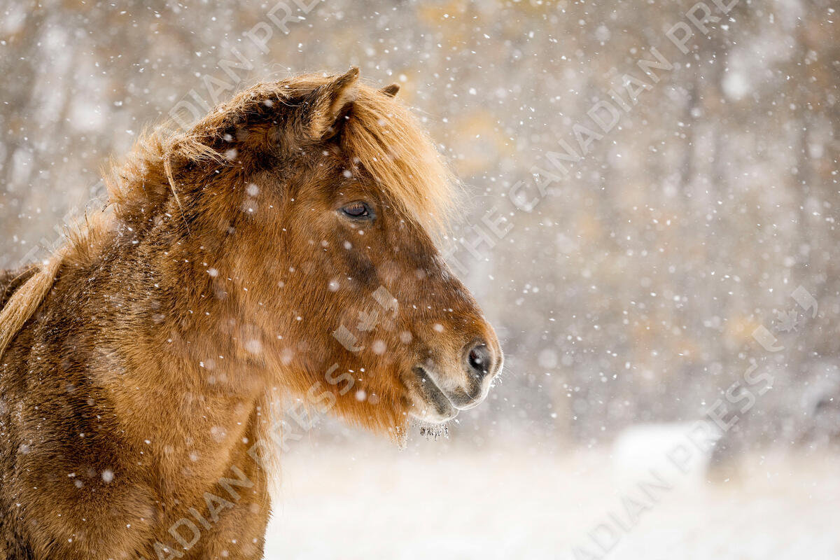 Icelandic mare Disa gazes out over snow covered pastures as snow falls near Cremona, Alta., Sunday, Oct. 12, 2025. Alberta got it's first snowfall of the season and is experiencing the coldest Thanksgiving in decades. THE CANADIAN PRESS/Jeff McIntosh