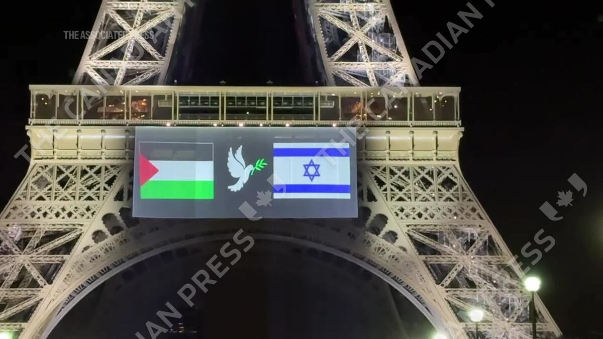 The Palestinian and Israeli flags, separated by a peace dove, were projected onto the Eiffel Tower late on Saturday. The display came as France prepares to formally recognize a Palestinian state at the United Nations General Assembly in New York. (AP video by Christophe Ena)