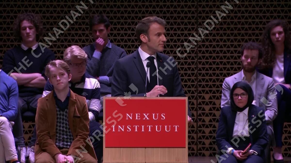 French President Emmanuel Macron was interrupted by protesters of his pension reforms during his speech on the European future in the Netherlands.