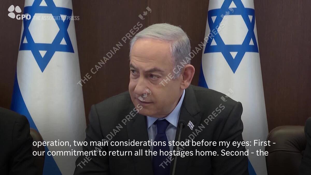 Israeli Prime Minister Benjamin Netanyahu held a cabinet meeting in Jerusalem on Sunday and hailed the "warriors" who took part in the Gaza raid which freed four hostages.