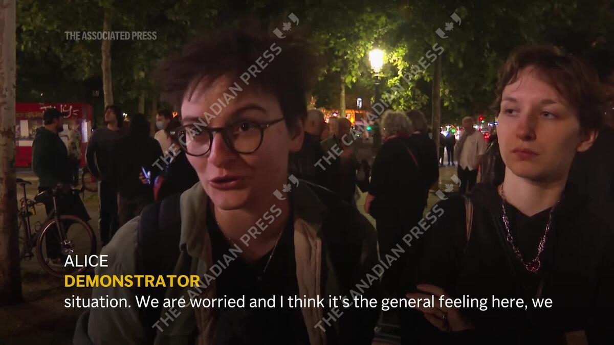 Hundreds gathered in Paris on Sunday night to vent their anger as projected results in the European Union's parliamentary election put the far-right National Rally party well ahead of other parties in France. (AP video by Alexander Turnbull)