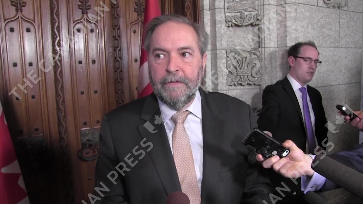 NDP Leader Tom Mulcair spoke after the federal budget was delivered in Ottawa, March 22, 2017. SOUNDBITE: Tom Mulcair, NDP Leader. CREDIT: The Canadian Press LANGUAGE: English and French. Contains black in between two clips.